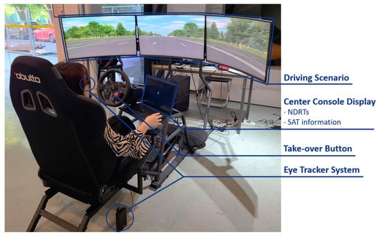 The experiment was carried out using a static driving simulator. The simulator includes three primary monitors (Samsung C32JG50FQC, 27 inches, 1920 × 1080 resolution, Samsung, Seoul, Republic of Korea), active pedals, a force-feedback steering wheel (Logitech G29 dual-motor force feedback steering wheel, Logitech, Lausanne, Switzerland), and an adjustable driver’s seat. A 2.1 surround sound audio system provides replications of the engine and driving sounds of the driver’s own and surrounding vehicles. The automated driving scenarios and functions were programmed and implemented using SCANeR™ studio (AVSimulation, Boulogne-Billancourt, France). The automation could be toggled via the red autopilot takeover button on the steering wheel. On the participants’ right-hand side, a laptop (ThinkPad X1 Carbon 344327C, 14 inches, 1600 × 900 resolution, Lenovo, Beijing, China) was mounted to simulate the vehicle center console display for presenting NDRT and SAT information for the participants. The NDRT and SAT information interface were programmed using ErgoLAB 3.0, which could present material in multiple formats and record participant responses. The SAT information interface for the components was drawn by Figma, and Adobe Premiere Pro 2023 was employed for the motion effects.