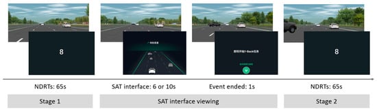 For each drive, the participants were asked to engage in NDRT in the center control display for about 65 s while the vehicle experienced automated driving, followed by a beep from the center control system, at which point the participant could see the SAT interface on the center control display regarding the hazardous event.