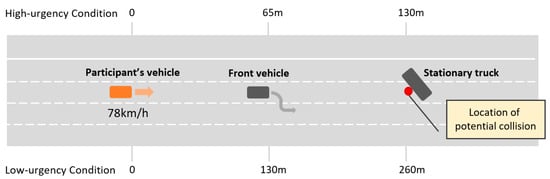 The independent variable of driving scenario urgency was manipulated according to the timing of the system’s detection of the hazard and the presentation of the SAT interface. Since highly automated driving systems rarely issue TORs, in this experiment, the timing referenced the takeover request lead time (TORlt) in the conditionally automated driving system and the constant speed of 78 km/h of the vehicle during autopilot (taking into account the 70–80 km/h speed limit on Chinese suburban roads). Based on previous studies, an acceptable TORlt was about 6 s when engaged in NDRT [35], and a relatively sufficient TORlt for driver to react was 12 s [36]. Thus, under high- and low-urgency conditions, the participant’s vehicle was 130 and 260 m from the hazard when the system detected the danger and presented the SAT interface. Figure 4 depicts the distances between vehicles under both urgency conditions. For each participant, the order of the two urgency conditions has been balanced using a random generator.