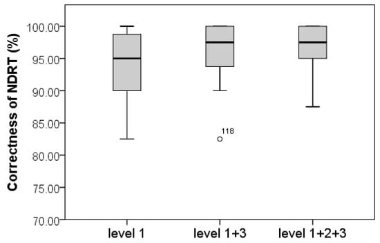 The program recorded all NDRT results. After data organization, the correctness of the NDRTs were presented as percentages. The data revealed no outliers, but were not normally distributed (p < 0.05). Tests showed that there was a significant effect of SAT on the correctness of the NDRT, i.e., χ2(2) = 8.475, p < 0.05, mean rank = 58.63, 80.25, and 78.63 for SAT level 1, SAT level 1 + 3, and SAT level 1 + 2 + 3, respectively (Figure 6). Pairwise comparisons showed that the difference between the SAT level 1 + 3 condition and the SAT level 1 condition and the SAT level 1 + 2 + 3 condition and the SAT level 1 condition were significant. However, tests revealed that there was no significant effect on correctness of NDRT in regards to scenario urgency and driving stage (p > 0.05).