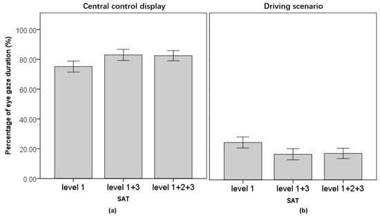 Overall mean and standard error of percentage of eye gaze duration on the central control display (a) and percentage of eye gaze duration for the driving scenario (b) measured by the SAT levels. Error bars are 95% confidence intervals.