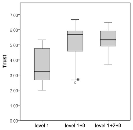 The trust data were not normally distributed (p < 0.05). Thus, non-parametric analyses were performed. Tests revealed that there was a significant effect of SAT on the participants’ trust, H(2) = 26.105, p < 0.05, mean rank = 18.71, 45.21, and 45.58 respectively, for SAT level 1, SAT level 1 + 3, and SAT level 1 + 2 + 3 (Figure 9). Tests revealed that there was no significant effect of scenario urgency on the participants’ trust, p > 0.05. Descriptive statistics reveled a higher trust score under the low-urgency condition (M = 4.96, SD = 1.175) than under the high-urgency condition (M = 4.57, SD = 1.266).