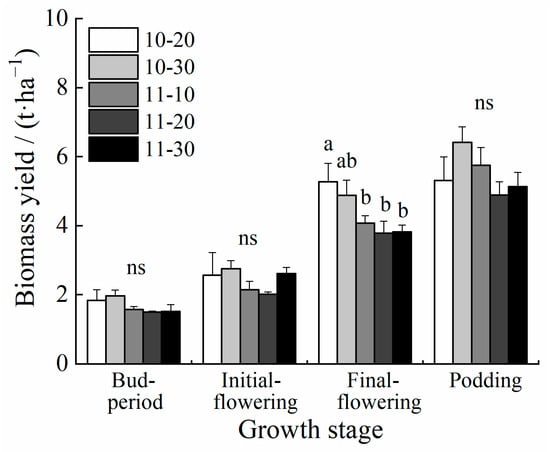 Biomass yield (t·ha−1) of forage rapeseed at four growth stages (bud period, initial flowering, final flowering, podding) as affected by transplanting date. The experimental treatments were five transplant dates (month-day): 10-20, 10-30, 11-10, 11-20, and 11-30. Different lowercase letters indicate significant differences among different transplanting dates in each growth stage at the 0.05 level. ns, no significant differences among different transplanting dates.