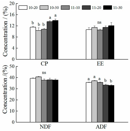 Nutritional content (%) of forage rapeseed at podding as affected by transplanting date. The experimental treatments were five transplant dates (month-day): 10-20, 10-30, 11-10, 11-20, and 11-30. The four measures of nutritional quality were crude protein (CP), ether extract (EE), neutral detergent fiber (NDF), and acid detergent fiber (ADF). Different lowercase letters indicate significant differences among different transplanting dates at the 0.05 level. ns, no significant differences among different transplanting dates.