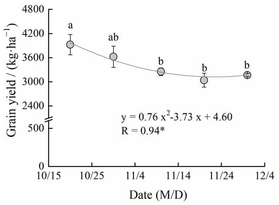 Grain yield (kg·ha−1) of rapeseed at maturity as affected by transplanting date (month/day) and the Pearson coefficients. The experimental treatments were five transplant dates (month-day): 10-20, 10-30, 11-10, 11-20, and 11-30. Different lowercase letters indicate significant differences among different transplanting dates at the 0.05 level. * p < 0.05.