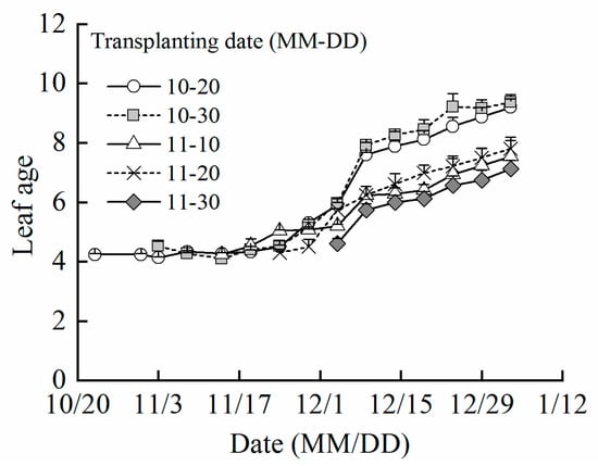 Dynamics of rapeseed leaf age as affected by transplanting date (month/day). The experimental treatments were five transplant dates (month-day): 10-20, 10-30, 11-10, 11-20, and 11-30.