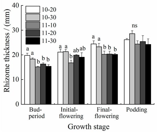 Rhizome thickness (mm) of forage rapeseed at four growth stages (bud period, initial flowering, final flowering, podding) as affected by transplanting date. The experimental treatments were five transplant dates (month-day): 10-20, 10-30, 11-10, 11-20, and 11-30. Different lowercase letters indicate significant differences among different transplanting dates in each growth stage at the 0.05 level. ns, no significant differences among different transplanting dates.