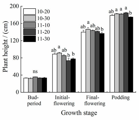 Plant height (cm) of forage rapeseed at four growth stages (bud period, initial flowering, final flowering, podding) as affected by transplanting date. The experimental treatments were five transplant dates (month-day): 10-20, 10-30, 11-10, 11-20, and 11-30. Different lowercase letters indicate significant differences among different transplanting dates in each growth stage at the 0.05 level. ns, no significant differences among different transplanting dates.