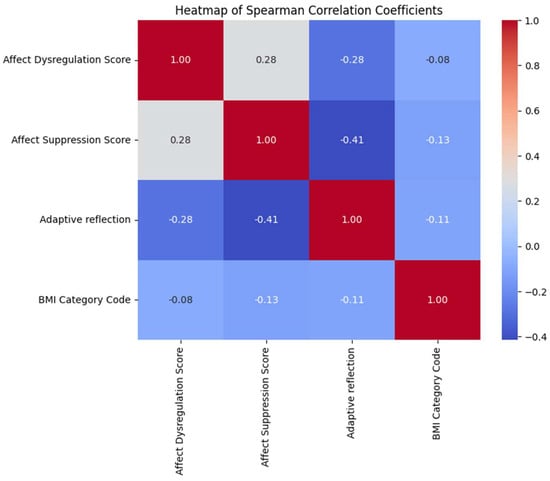 These correlations were not statistically significant, with p-values spanning from 0.461 to 0.630, suggesting that the observed relationships may not be robust within the current sample. A heatmap was constructed to visually represent these findings (Figure 1), elucidating the direction and degree of associations among the variables studied. The intensity of the colors on the heatmap corresponds to the strength of the correlation, with cooler tones reflecting negative correlations. Notably, this visual tool underscores a modest negative correlation between Adaptive Reflection and the BMI Category Code (r = −0.11), pointing to the potential for children who are more reflectively adaptive to fall into lower BMI categories. Conversely, the Affect Suppression score’s weak negative correlation with the BMI Category Code (r = −0.13) signals a negligible association with BMI categories.