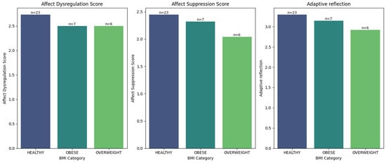 Average psychological scores by BMI Category for children aged 8–11. The figure displays the mean scores of Affect Dysregulation, Affect Suppression, and Adaptive Reflection for children in different BMI categories, with each bar denoting the average score for Healthy, Overweight, and Obese classifications. The number of participants in each category is annotated within the respective bars, offering an immediate visual comparison of the psychological attributes across the BMI spectrum.