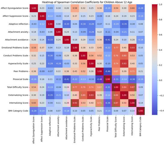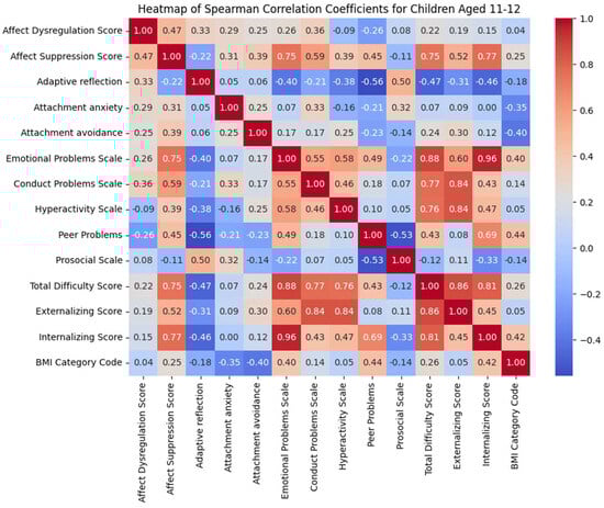 The study utilized data collected through questionnaires completed by children, focusing on a range of psychological measures including Affect Dysregulation score, Affect Suppression score, Adaptive Reflection, attachment anxiety, attachment avoidance, Emotional Problems Scale, Conduct Problems Scale, Hyperactivity Scale, Peer Problems, Prosocial Scale, Total Difficulty score, Externalizing score, and Internalizing score. In addition, data on the children’s BMI Category, BMI, and BMI percentile were included to explore potential correlations. The BMI categories were encoded into numerical values (HEALTHY: 0, OVERWEIGHT: 1, OBESE: 2) to facilitate statistical analysis. Spearman’s rank correlation coefficient was used to assess the relationship between the psychological measures and the BMI Category Code, providing insights into how these variables may be interconnected.