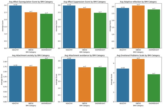 Figure 2 presents a comparative visualization of the average psychological scores across BMI categories for children aged 8–11. The bar graphs depict a trend where the Affect Dysregulation and Affect Suppression scores do not vary significantly across the BMI categories. However, the Adaptive Reflection scores show a slight decrease from the Healthy to Overweight and Obese categories. The graph indicates that while children’s ability to regulate and suppress affect might not differ markedly with their BMI status, their Adaptive Reflection abilities may be inversely related to higher BMI categories. This pattern suggests that children who are overweight or obese might experience challenges in effectively reflecting on and adapting to situations, which is an aspect worth exploring further in the context of obesity interventions.