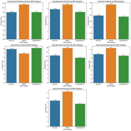 Figure 7 continues the exploration of psychological dimensions related to BMI categories, presenting the average scores for Conduct Problems, Hyperactivity, Peer Problems, Prosocial Behavior, Total Difficulty, Externalizing Behaviors, and Internalizing Behaviors. Each bar graph provides insights into how children within each BMI classification score on these psychological measures, suggesting trends that may indicate broader behavioral and emotional challenges associated with childhood obesity. These plots underscore the potential impact of various psychosocial factors on children’s physical health outcomes.