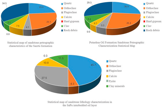 The SaPu interbedded reservoir has similar petrological characteristics to the adjacent Saertu and Putaohua formations, with a low rock maturity, a high clast and feldspar content, and a low quartz content, as shown in Figure 1. Most of the parent rock compositions of such reservoirs are close to volcanic sedimentary areas, so the plasticity of these minerals is high, while their physical properties are generally poor after transportation and deposition [8].