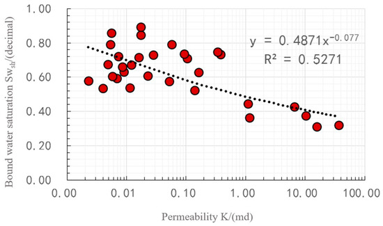 Bound water is mainly caused by fine lithology and a high mud content, which overall reflects the magnitude of permeability, so this study used a binary regression model with a single correlation analysis using the permeability (Figure 14) and quality factor (Figure 15) subsets, and a computational model.