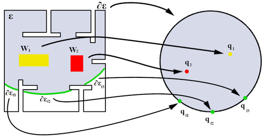 Let denote the compact and connected workspace of the robot. Within W exists a finite set of inner obstacles . The workspace is considered static and the only dynamic elements are the robots themselves. The boundaries of the outer and inner curves are denoted as and and the entirety of the workspace’s boundaries can be referred to as (see Figure 1).