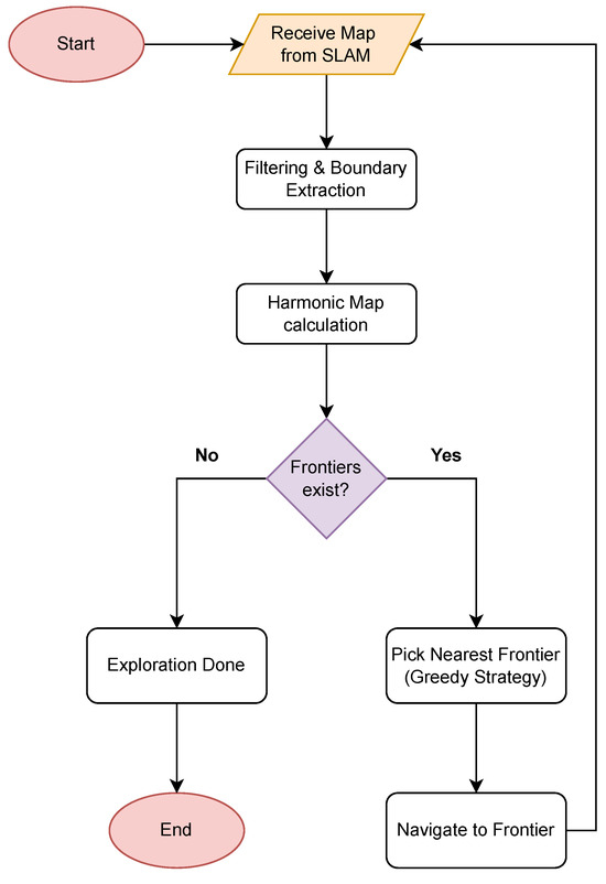 Another popular approach is using sampling-based algorithms to search and select areas to be explored. In [7], a method called UFOExplorer is proposed that continuously expands a dense undirected graph, optimized for fast and efficient exploration. Rapidly-exploring Random Tree (RRT) and its variants are mainstream among various sampling-based exploration methods. In [8], a novel method is presented where the robot is guided to the unexplored region using multiple RRTs, removing the requirement for frontier exploration. Artificial Potential Fields have been utilized in the field of robotic exploration, such as in [9,10], where a harmonic potential field function is used for navigating to frontiers.