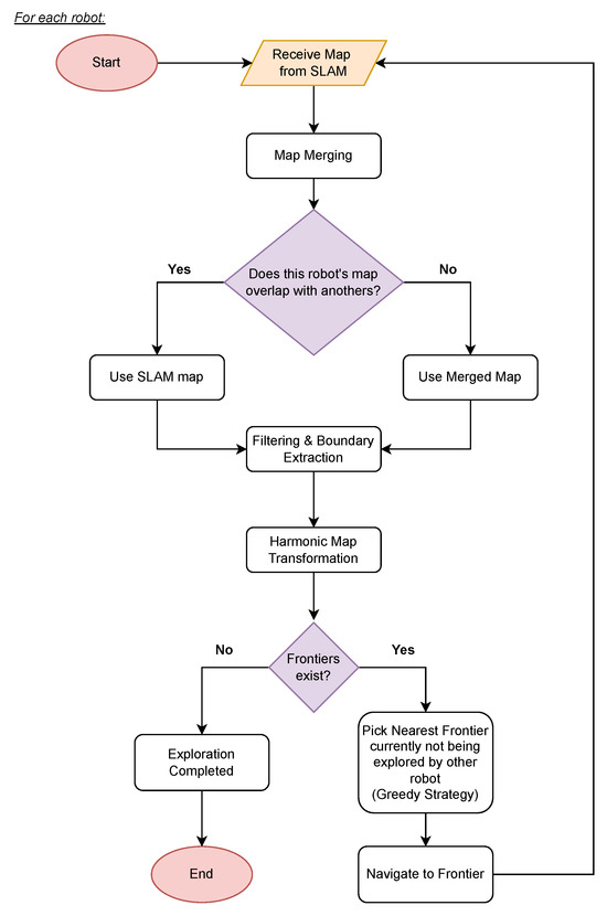 A potential challenge arises post-merging, wherein multiple robots may inadvertently explore the same frontiers simultaneously. To address this issue, a strategy is employed to ensure efficient frontier allocation among robots. At the start of the exploration process, each robot is assigned an arbitrary priority number, with a smaller number indicating higher priority. The priority number assists the frontier allocation process, as constant changes in the goal frontier are avoided when the allocation metric (the distance from the frontier in this case) of two agents is equal. When selecting a frontier to navigate to, the robots with higher priority share a merged map and state their current goal frontier. Then, a check is performed to detect any duplicate frontiers. If duplicates are found, the robot’s current frontier goal is set as a random frontier that no other robot with higher priority has set as a goal. If all other frontiers are taken, then the robot will not pick a goal frontier and stay stationary until a new frontier is discovered. Using the above rule, the inefficient scenario of multiple robots exploring the same frontier is avoided. An exception is made when the robot with higher priority is located outside a certain range, chosen as the laser scanner’s maximum distance. In that case, both robots head to the same goal and it is assumed that a new nearest frontier will be discovered during exploration. This approach minimizes redundancy and maximizes exploration coverage, thereby optimizing the collective exploration efforts of the multi-robot system.