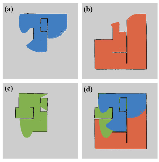 The final map produced by each robot. (a–c) are the partial maps and (d) is the merged map of the robot that produced (a).