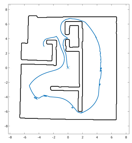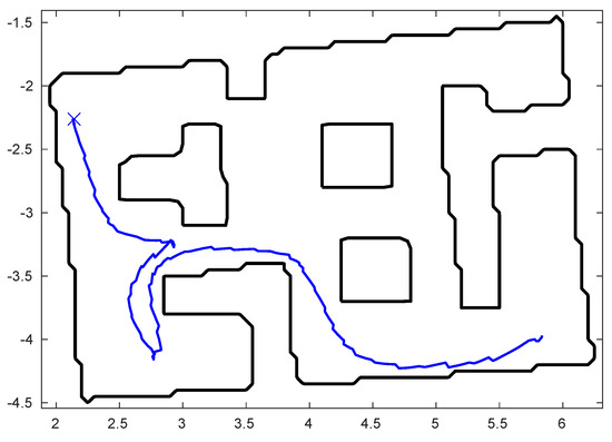 We simulated the following scenario in the Gazebo simulator. The proposed method was applied on a single TurtleBot3 Burger to explore a 13.5 m × 14.5 m workspace with a large wall as an inner obstacle. For SLAM, a simulated LIDAR with a 5 m laser range is utilized. The resulting path can be seen in Figure 7. The robot manages to explore the workspace covering a path distance (PD) of 51.40 m with an elapsed time (ET) of 276.68 s. It should be noted that ET in simulated experiments refers to the simulated ET.