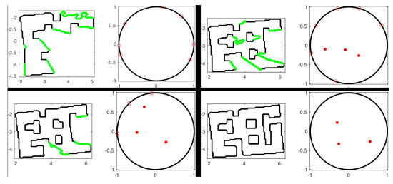 Some of the HMT’s for Exploration calculated online during the exploration experiment. Top left is the initial transform and bottom right is the final when the workspace is considered fully explored. The boundaries are shown with a black line, the frontiers with a green line and their mapping on the HMT is shown as a red circle. The mapping of the inner boundaries on the HMT is shown with a red dot.