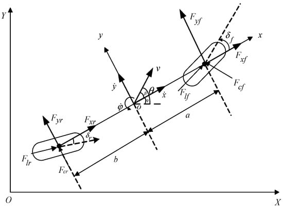 where and are the driverless ferry vehicle’s accelerations along the and directions, respectively; is the vehicle’s total mass; is the heading angle acceleration; is the moment of inertia of the driverless ferry vehicle around the z-axis; and are the longitudinal force on the front and rear wheels of the driverless ferry vehicle in the x-axis direction; and are the lateral forces on the front and rear wheels of the driverless ferry vehicle in the -axis direction, respectively; is the speed of the driverless ferry vehicle along the -axis; is the heading angular speed of the ferry vehicle; and distances and , respectively, are measured from the driverless ferry vehicle’s center of mass to its front and rear axles.