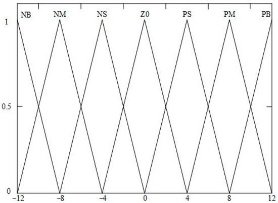 The range of the speed deviation () and the speed deviation change rate () in the fuzzy controller are both defined as [−12, 12], so the domain of the speed deviation () and the speed deviation change rate () are both [−12, 12]. The output of the fuzzy controller is , , and , as shown in the following equation: