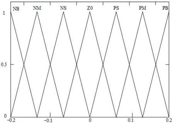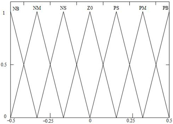 The fuzzy domain of is defined as [−0.5, 0.5], and the fuzzy domain of and is defined as [−0.2, 0.2]. Figure 4, Figure 5 and Figure 6 display the fuzzy controller’s input and output variable affiliation functions, respectively.