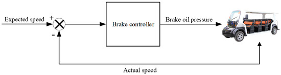 To complete the braking control of the driverless ferry vehicle in the driverless state, the braking torque is calculated using the difference between the desired speed and the current speed. Consequently, the braking oil pressure is an output based on the relationship between the braking torque and the braking oil pressure. The braking control schematic diagram is shown in Figure 11.