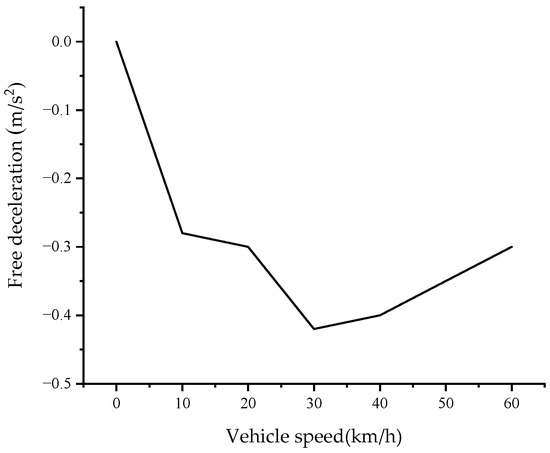 The testing of the vehicles was achieved by employing different speeds and using experimental methods, and the relationship between the free deceleration of the ferry vehicle and the speed is shown in Figure 12.