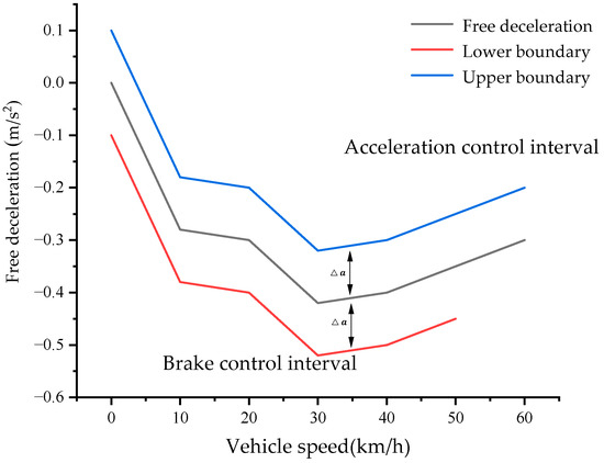 According to the actual vehicle debugging and experience, the acceleration tolerance interval is taken as , and the acceleration and braking switching rules are established through the expected acceleration () and the maximum free deceleration () as follows: