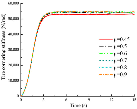 The tire lateral deflection stiffness estimation model was built in MATLAB/Simulink, the recursive least squares algorithm was compiled in the S-Function module, and the joint simulation with CarSim 2019.0 software was carried out to solve the estimated tire cornering stiffness. Figure 15 shows the tire side stiffness results estimated under different road adhesion coefficients.