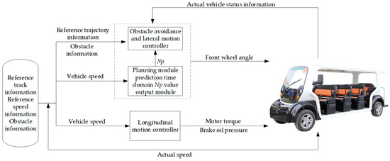 The casualties and economic losses caused by road traffic accidents are increasing year by year. In the face of such serious traffic safety problems, it is urgent to improve automobile safety performance. Intelligent vehicles, with their capacity to reduce traffic accidents, enhance transport efficiency, and offer promising market prospects, have garnered significant attention. They hold the potential to drive forward the future of the automotive industry [1]. Self-driving technology is the key technology of vehicle active safety, which can effectively reduce the loss of personnel and property caused by traffic accidents. A good control algorithm is the premise of obstacle avoidance and trajectory tracking in a driverless vehicle. Researchers, both domestically and internationally, have extensively investigated this topic. To address the problem of path planning and trajectory tracking, Li et al. [2] used adaptive dynamic planning (ADP) and the APF method to solve the dynamic path planning problem. It has been proven that this method can plan the obstacle avoidance path in both dynamic and static environments. To improve the safety of the planned obstacle avoidance paths, Li et al. [3] proposed a novel path-planning approach utilizing enhanced genetic algorithms and dynamic window methods. Gao et al. [4] proposed an adaptive model predictive controller through fuzzy adaptive control methods to achieve the adaptive optimization of the weights of the objective function in the model predictive, aiming to enhance control effectiveness. The trajectory tracking method based on optimal preview was mainly proposed by Macadam [5,6] and improved gradually. In this method, the vehicle is considered to be in uniform motion or a variable speed motion with slow speed change, so that the vehicle’s horizontal and vertical controls are decoupled. Path tracking is accomplished using lateral control, and speed tracking is accomplished using longitudinal control. In order to better imitate the method of a real driver’s driving, Li et al. [7] considered the multi-point preview inaccuracy of the path, designed an MPC controller using a dynamic model, and constructed an articulated vehicle model using dynamic model predictive control, which improved the stability under limited operating conditions. Li et al. [8] proposed a steering strategy based on fuzzy logic to realize parameter self-adjustment based on displacement error to make its trajectory tracking more stable and accurate. In order to improve the parameter uncertainty of the bicycle model, Guo et al. [9] designed a longitudinal controller based on adaptive estimation of dynamic surfaces through a neural network. The experimental data show that the controller drives safely within the operation limit of the vehicle. Tang et al. [10] investigated the utilization of fuzzy controllers and model predictive controllers in intelligent vehicle trajectory tracking control. And on this basis, the PSO algorithm was used to study the parameter optimization of the prediction time domain and control time domain in the model predictive controller. Elias et al. [11] optimized the PID longitudinal speed controller. The controller has better real-time performance and tracking accuracy than the PSO algorithm-based controller. Razmjooei et al. [12] designed a reverse-tracking control based on disturbance observer, which is used to estimate and track the reference signal of electro-hydraulic actuator (EHA) system in finite time. The key idea is to use the monotone increasing function related to the control target to improve the control performance, in which Lyapunov stability analysis is used to guarantee the finite time boundedness criterion. The proposed method has higher accuracy and faster convergence. Waschl et al. [13] proposed a distributed model predictive control method for the special situation of fully autonomous vehicles in which multiple agents can pass through intersections at the same time, while maintaining a sufficient safe distance from conflicting agents. After the simulation, the study conclusively demonstrated the effectiveness of the method. Ye [14] constructed a new lateral control algorithm for driverless cars that utilizes the linear complementarity problem (LCP) approach as an MPC optimization solution. The simulation shows that this leads to improvements in driving stability and real-time performance. Paden et al. [15] investigated and studied the current planning and control algorithms and provided side-by-side comparisons that contribute to an in-depth understanding of the advantages and limitations of the reviewed methods and help researchers make system-level design choices.