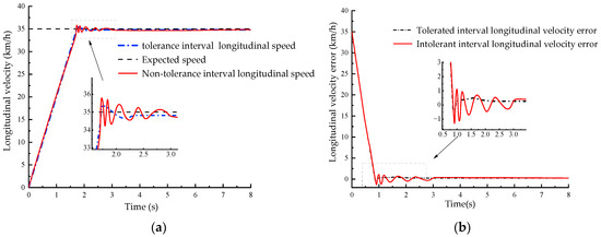 As can be seen in Figure 19a, the longitudinal speed of the two longitudinal control strategies of the driverless ferry vehicle is compared in the process of trajectory tracking. In the case of longitudinal control without tolerance zones, although the ferry vehicle can finally stably track the desired trajectory, the longitudinal speed fluctuates greatly during the whole tracking process, resulting in the problem that the frequent switching between acceleration and braking modes of the ferry vehicle affects the comfort and stability of the speed control. When the longitudinal control with tolerance interval is adopted, the longitudinal speed fluctuation is significantly reduced, and the expected speed can be quickly tracked and stabilized, so that the driverless ferry vehicle accelerates in the braking mode, switching times are significantly reduced, and driving is smoother. As illustrated in Figure 19b, the longitudinal velocity error fluctuates greatly when there is no tolerance interval for longitudinal control, and the maximum longitudinal speed error is as high as 0.78 m. When the longitudinal control with tolerance interval is adopted, the maximum longitudinal speed error is about 0.44, the fluctuation of the longitudinal velocity error is significantly reduced, and the longitudinal velocity error tends to be stable faster, which is 43.59% lower than that of the intolerant interval. It can be seen that the stable speed and stability of the longitudinal motion controller designed in this study were significantly improved when tracking the expected speed, which effectively solves the problem that the driverless ferry vehicle switches between acceleration and braking modes too frequently, affecting the comfort and stability of speed control.