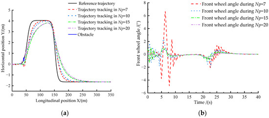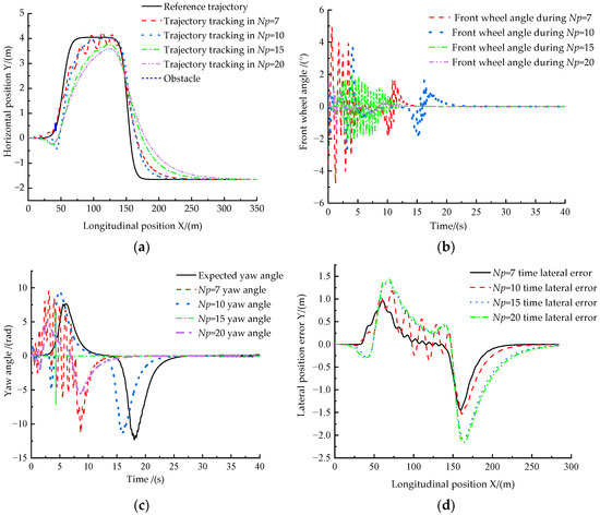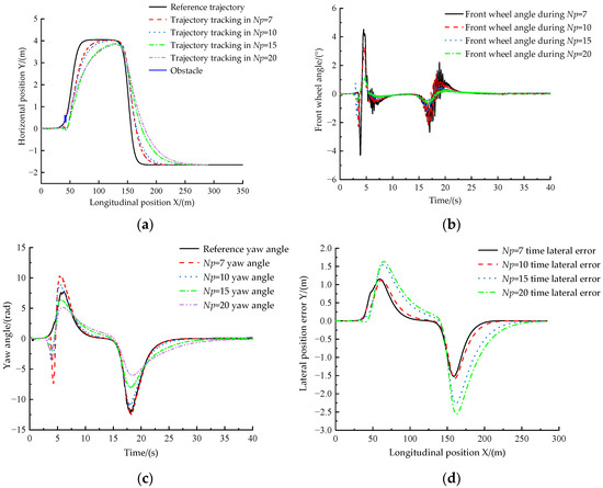 From Figure 23a, we can see that, when the speed is raised to 36 km/h, the designed obstacle avoidance function algorithm can avoid obstacles because of the high speed of the driverless ferry vehicle when the prediction time domain, , of the planning module is too high, while the other three cases can avoid obstacles smoothly. From Figure 23b,c, we can see that the tracking error of the driverless ferry vehicle to the expected yaw angle is minimum when . As can be seen from Figure 23d, except for , the tracking error of the driverless ferry vehicle is the smallest, and the tracking effect is the best when is used. Therefore, when the speed of the driverless ferry vehicle is increased to 36 km/h, the predicted time domain, , value in the planning module is set to 10.