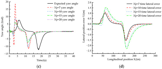 As seen in Figure 22a, when the speed is increased to 18 km/h, the autonomous ferry vehicle’s obstacle avoidance scenario is similar to that at a speed of 9 km/h, and the values can avoid obstacles smoothly, except for . As Figure 22b,c demonstrate, when the driverless ferry vehicle runs for about 4 s, it receives information about the obstacles ahead and avoids them, so the yaw angle of the ferry vehicle does not track the reference value. From Figure 22d, we can see that the maximum error still occurs at the turn, in which the tracking error of the driverless ferry vehicle is the smallest and the tracking effect is the best when predicting the time domain, . To sum up, when the speed of the driverless ferry vehicle is increased to 18 km/h, the predicted time domain, , value in the planning module is still set to 7.