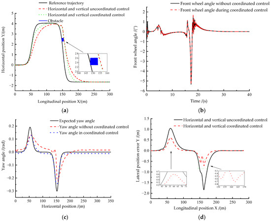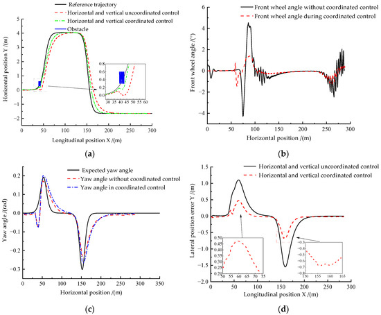 The horizontal motion and the longitudinal motion work separately; that is, there is no coordinated control. From Figure 24a, it can be seen that when the obstacle is in the first half of the path and there is no coordinated control in the horizontal and longitudinal directions, the driverless ferry vehicle is about to encounter obstacles and bends. Although it can avoid obstacles, the tracking accuracy of the reference trajectory is poor. When coordinated control is carried out horizontally and vertically, the tracking accuracy of the ferry vehicle relative to the reference trajectory is significantly improved. From Figure 24b,c, we can see that, when there is no coordinated control in the horizontal and longitudinal directions, the ferry vehicle will wobble frequently when it encounters obstacles. When horizontal and longitudinal coordinated control is carried out, the swing amplitude and frequency of the driverless ferry vehicle are greatly reduced, the output front wheel angle is more stable, and the tracking stability of the expected yaw angle is significantly improved. Figure 24d shows that, in the absence of coordinated control in the horizontal and vertical directions, the maximum lateral position error has exceeded 1.5 m. However, when coordinating control horizontally and vertically, the maximum horizontal position error is reduced to less than 0.7 m, and the tracking error is reduced by 53.33% compared to uncoordinated control in the horizontal and vertical directions. Through the above analysis, we can see that when there are obstacles in the front half of the road, the horizontal and longitudinal motion coordination control strategy designed shows a more outstanding effect of obstacle avoidance replanning and trajectory tracking control.
