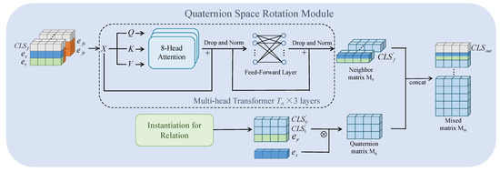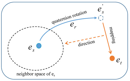 Figure 6 shows the specific construction of the Quaternion space rotation module. We combined the outputs and with er to obtain a relation instantiation matrix. We performed a Hamilton product of with each of the three vectors in this matrix, resulting in a quaternion rotation of the source entity from three different angles and producing a quaternion matrix as