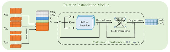 The contextual information of an entity can be reflected by considering its neighboring entities in the KG, also known as “neighbors”. We designed a hierarchical Transformer structure to enable relations to fully integrate the environmental information contained within a given entity’s neighbors. Our goal was to ensure that relations can have different rotations in different environmental contexts. Figure 5 shows the specific construction of the relation instantiation module. In relation instantiation, we select a significant number of second-hop, third-hop, and fourth-hop neighbors, represented by , , and , to provide contextual information for the source entity. The nth-hop neighbors refer to the nodes that the source entity can reach through n transformations of relations. In this context, each transformation of the source entity to the tail entity through a relation in the triple is considered a first-hop. Neighbors with smaller hop counts, such as 1-hop and 2-hop neighbors, have a closer relationship with the source entity. They can directly reflect relevant information about the source entity. On the other hand, neighbors with larger hop counts, such as 3-hop and 4-hop neighbors, can provide additional information by roughly reflecting the scene where the source entity is located. It is important to note that we do not use the relations of these neighboring triples, as the size of the relation set R is significantly smaller than the number of neighboring triples we will select. As a result, these relations do not contribute to the feature representation of the source entity.