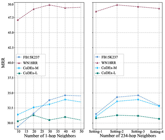 For the multi-hop neighbors, we conducted further experiments with varying multi-hop neighbor settings, as listed in Table 6. For the multi-hop neighbors, their influence on the model’s performance was not substantial. This is attributed to the fact that the embeddings of multi-hop neighbors are indirectly utilized in the instantiation for relation modules through an average pooling operation, which is not directly employed in constructing the features of the target entity. In terms of specific datasets, FB15K237 and CoDEx-L achieved their best performance in Setting-2, whereas WN18RR and CoDEx-M attained their optimal performance in Setting-3.