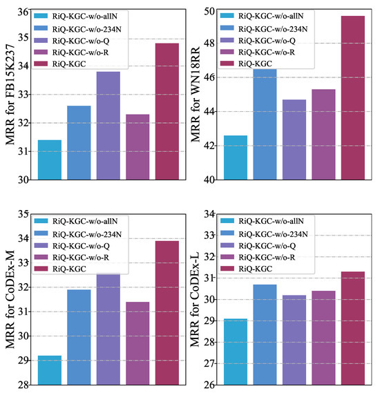 Figure 9 presents the performance of each ablation model on the four datasets using the MRR metric, which can show the overall recall rate of samples. The most significant conclusion is that “RiQ-KGC” achieved the best performance, while “RiQ-KGC w/o all N” exhibited the worst performance, indicating the crucial role of neighboring nodes. The efficacy of “RiQ-KGC-w/o-R” was generally poor, highlighting the importance of relation instantiation methods. “RiQ-KGC-w/o-234N” outperformed “RiQ-KGC-w/o-R” in all datasets, demonstrating that multi-hop neighbor information enhances the relation instantiation method. The impact of “RiQ-KGC-w/o-Q” is highly uncertain because the proportion of complex relations in the four datasets varied and quaternion rotation patterns have a greater advantage when applied to datasets with a higher ratio of one-to-one relations.