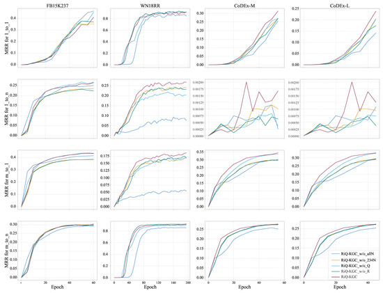 From the results, it is evident that there is no significant difference in the modeling speed and effectiveness of each ablation model for the one-to-one and m-to-n relations, indicating that each ablation model does not have a specialized ability to handle these two complex relations. However, there are significant differences in the modeling processes of one-to-n and m-to-one relations among different ablation models. Specifically, “RiQ-KGC” and “RiQ-KGC w/o-Q” usually perform better, whereas “RiQ-KGC w/o-234N” and “RiQ-KGC w/o-R” usually perform worse, and “RiQ-KGC w/o-all-N” is the worst in all scenarios. This demonstrates the targeted contribution ability of “RiQ-KGC-w/o-234N” and “RiQ-KGC-w/o-R” to complex relationships, which is consistent with the theory in Section 3.2.