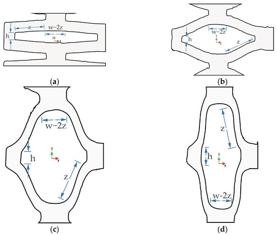 Figure 3b illustrates the same rectangular cut in a subsequent stage of deformation, still revealing the proportions that constitute the cut, albeit with the rectangular shape having deformed into an octagonal form. In Figure 3c, the kirigami cut is depicted in an advanced stage of deformation, where the rectangular shape has been lost, and a more defined octagonal shape has taken its place, with the sides dependent on the original rectangular geometry, including the cut height “h”, the cut length “w”, and the intersecting length “z” between the lower and upper cells (defined in Figure 1). Finally, Figure 3d presents the kirigami cut at its maximum stage of deformation, where the rectangular form has been completely lost, and an octagonal figure has formed, with its sides delineated by the constraints imposed by the original rectangular cut geometry.
