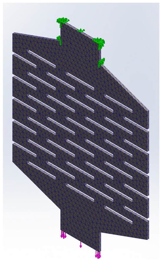 Proposed triangular-type meshing over a test specimen described by FEM. The clamping condition is of the encastre type shown in green in the figure, while the applied force, shown in purple, subjects the specimen to tension.