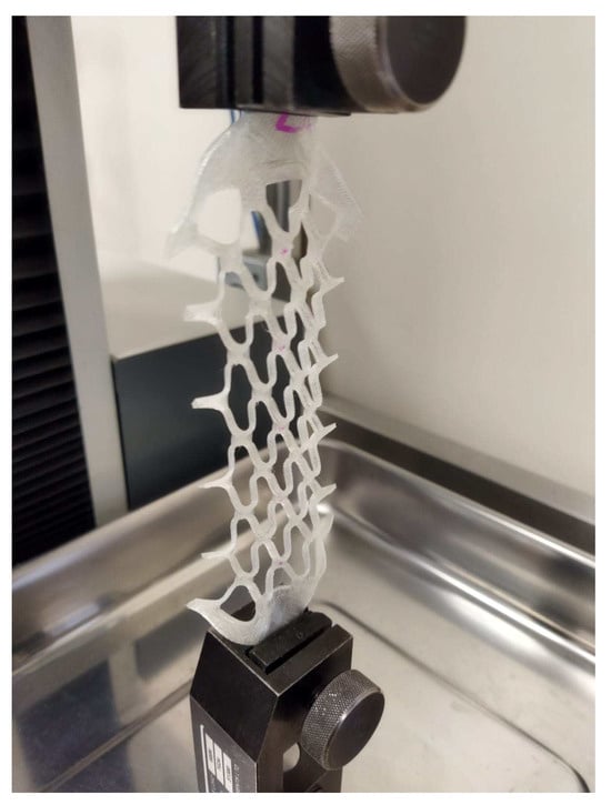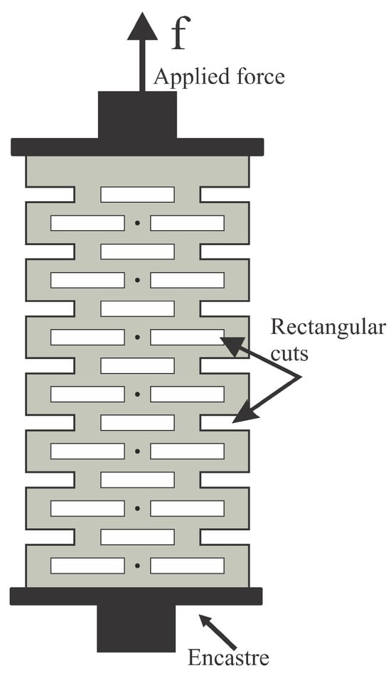 To compare the behavior of the kirigami pattern with rectangular cuts, an experimental stress test was conducted on a cell with rectangular cuts. During the tensile test, one end of the test specimen was fixed, and a force was applied to the other end, causing deformation similar to that in the FEM simulation as depicted in Figure 5. The test was carried out using the “LLOYD Instruments Texture Analyzer”.