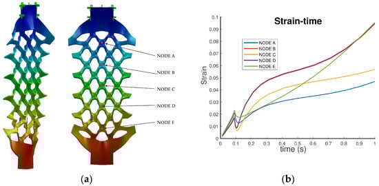 FEM analysis demonstrates how deformation occurs when force is applied. Figure 6 shows the transitional state of the kirigami-cut test specimen for one configuration. The analysis indicates that all the cuts experience uniform deformation along the test specimen, except for those at the extreme points. Due to varying constraints, these cuts do not reach maximum deformation, in contrast to the central cuts. Deformations outside the plane of the specimen also occur as the force increases, which are estimated by the FEM simulation, as shown in Figure 6a and observed in experimentation. The FEM simulation also provides us with the results of the patterns’ behavior concerning the strain–time simulation shown in Figure 6b and the stresses at the nodes distributed along the central points of the specimen. It is important to note that while the FEM study gives us results per node, the conducted experiment considers the entire specimen as a single mechanical entity.