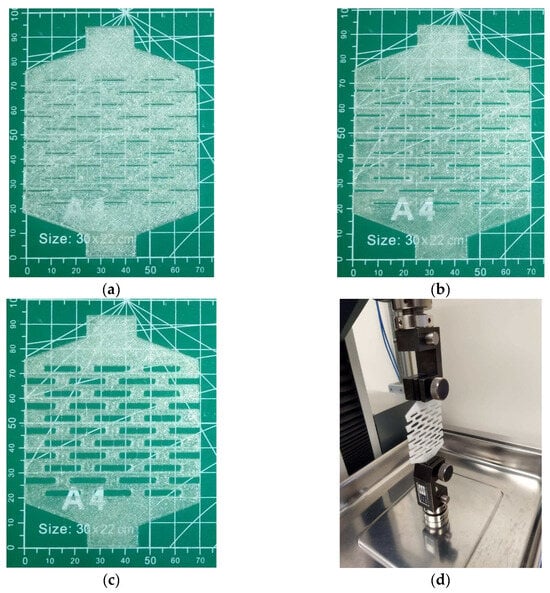 The experimental results demonstrate that there is a variation in the behavior of the different specimens in response to changes in the width of the cuts. Similarly, various types of variations can be assessed, such as changes in width, length, and distribution. However, the characterization of the specimens with rectangular cuts allows determining their behavior in response to cut variations. In Figure 7a, the specimen with minimal cuts is shown; these cuts were traced in the 3D printing process and subsequently made directly with a knife. In Figure 7b, the specimen with 1 mm thick cuts is displayed, while in Figure 7c, the specimen with 1.5 mm thick cuts is shown. A total of eighteen test specimens were manufactured for the experimental development, with six specimens for each type of cut and distribution presented. Finally, in Figure 7d, the tension test is shown being conducted on the Lloyd Instruments Texture Analyzer, where it can be observed that one end is secured while a vertical force is applied to the other end, causing displacements and stresses.