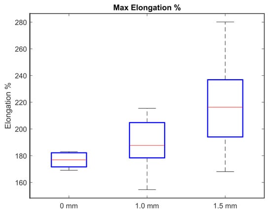 The variation in maximum elongation obtained with each cutting variation is displayed in Figure 9. For the test specimen in which cuts with the greatest width (1.5 mm) were performed, the highest average elongation of 218 percent was achieved. For the specimen with 1 mm cuts, the average elongation was 188 percent, while for the specimen with the minimum cut, the average obtained elongation was 176 percent. In terms of the variation observed across the tests, it is noted that this variation in final elongation increases with the width of the cut applied to the specimen. Upon reviewing the experimental tests, it was observed that the specimens tended to slip from the grips of the testing device as the displacement increased. Additionally, for tests with a 1 mm wide cut, specimens reached the rupture point at different locations. These variations are believed to be primarily attributed to the manufacturing process.