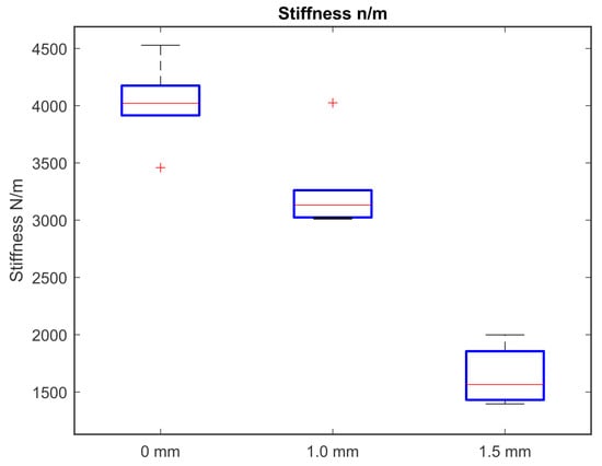 Stiffness distribution of each test group. During the data analysis, outliers are displayed for the group with the minimum cut and for the group with a 1 mm cut. This atypical variation (marked with a ‘+’) in the graphs is associated with the manufacturing process of the specimens.