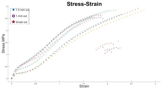 In Figure 11, the stress–strain relationship is shown for a set of experimental tests. It can be observed that each group of specimens exhibits a behavior trend according to the type of rectangular kirigami cut they had. Specimens with minimal cuts show higher stress against the presented deformation, and similarly, the slope of these curves representing stiffness is also higher. Specimens with a 1 mm wide cut reduced the amount of stress for a similar unitary deformation, and the slope of the trend was also lower. Finally, for specimens with a rectangular cut with a width of 1.5 mm, the stress decreased significantly, and the slope of the trend also decreased compared to that of the previous specimens. It is important to note that in this test, not all specimens reached the breaking point due to the test device’s stroke. This can be observed in the vicinity of strain 2, stress 1.5 MPa, where measurements taken by the device are presented once a rupture point occurred in the test specimens with minimal rectangular cuts and with 1 mm wide rectangular cuts. The absence of points related to specimens with 1.5 mm wide cuts is because these specimens did not reach the rupture point during the testing machine’s run (trajectories marked with an asterisk on the graph).